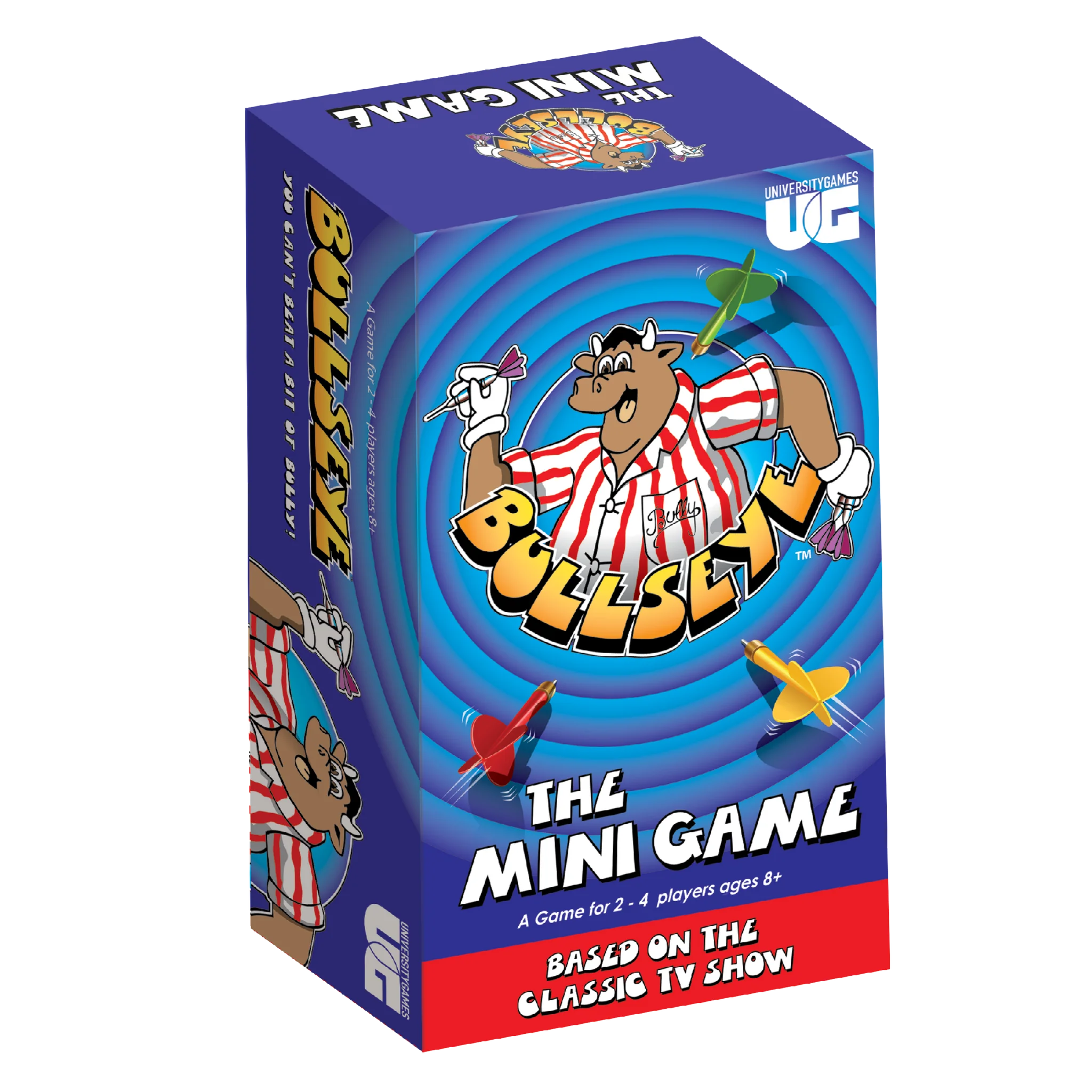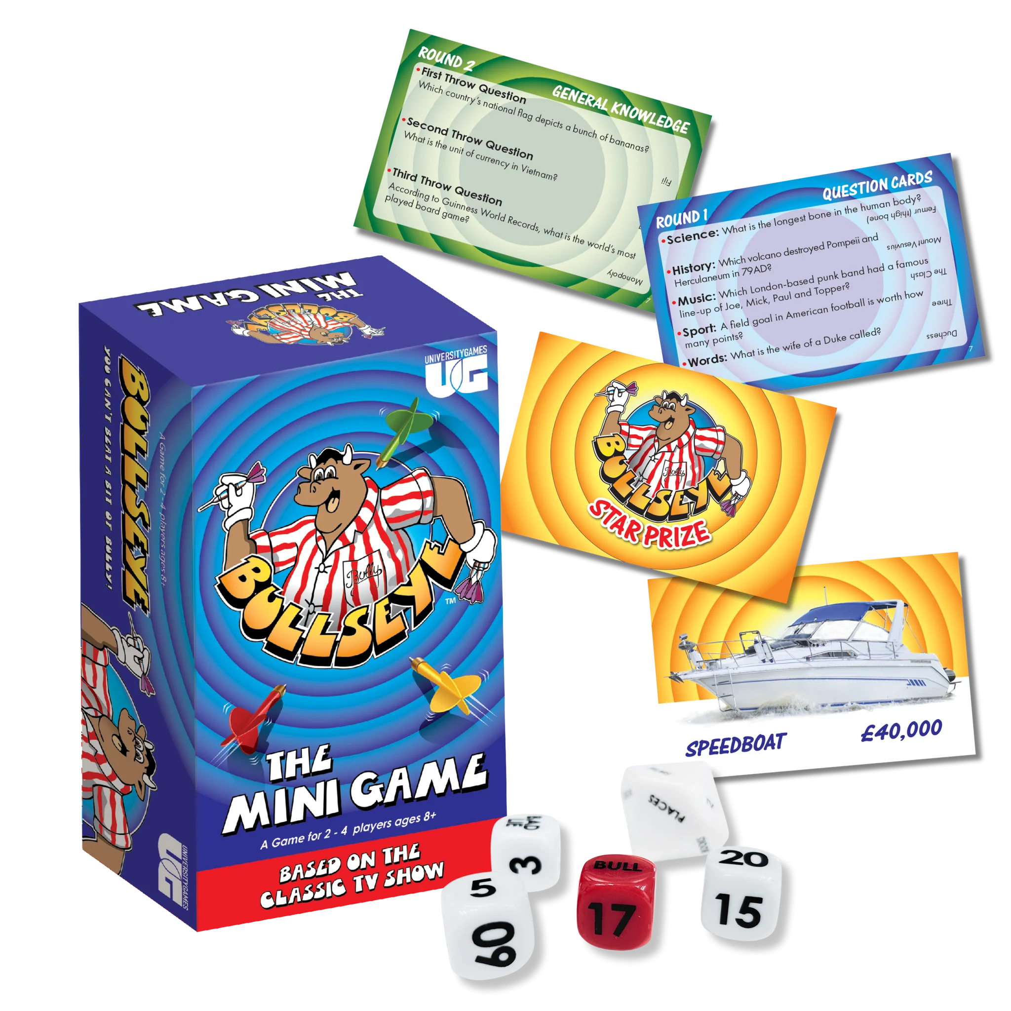 Step into the exciting world of the classic TV game show with Bullseye The Mini Game! This compact card game captures all the thrilling elements of the beloved darts quiz programme. Perfect for family game nights, it features innovative 'darts dice' that cleverly simulate the dart-throwing excitement of the original show, alongside a unique 10-sided category dice for the knowledge rounds. All the categories from the world-famous Bullseye TV Show are represented including Science, Sport, Spelling, Music, Films and TV, Places, Books, Words, and History. Players aged 8 and above can compete through various rounds, testing their general knowledge and luck as they aim for Bully's Star Prize. The game comes packed with entirely original questions across multiple categories, making it both an excellent standalone entertainment option and a brilliant complement to the Bullseye Main Game. Whether you're a fan of the original show or simply looking for an engaging quiz game, this 2-4 player format provides the perfect balance of skill, knowledge, and chance. Experience the nostalgia and fun of this British television classic in a convenient card game format that's sure to entertain for hours, and the perfect size as a travel and and holiday game.