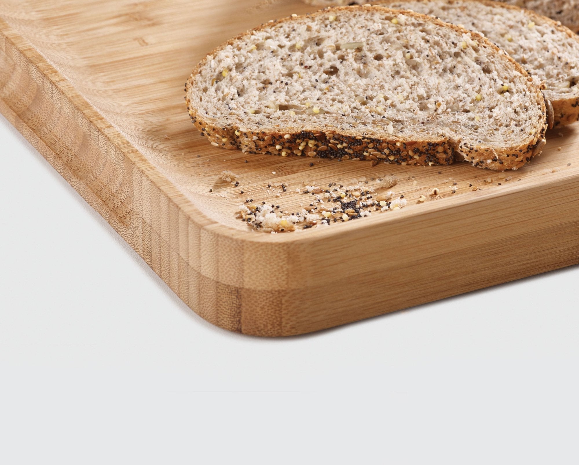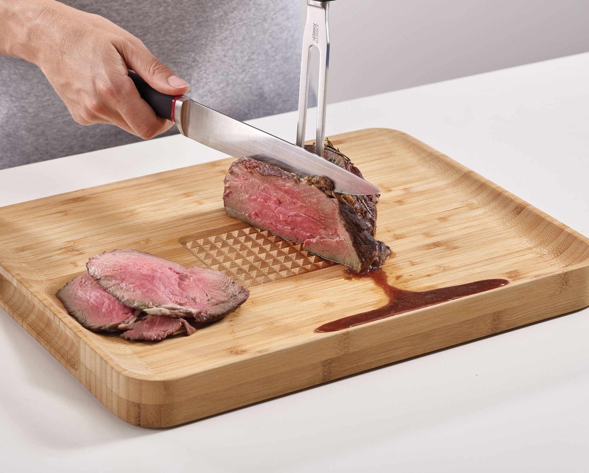 This heavy duty chopping board is made from tough, natural bamboo and features an integrated food grip for holding meat, vegetables and bread whilst cutting. It has an angled cutting surface - to help catch meat juices and breadcrumbs. Handle recesses on the sides make carrying easy and non-slip feet on the base help to keep it in place whilst cutting. Its beautiful finish is complimented with an etched stainless steel badge set into its front edge.