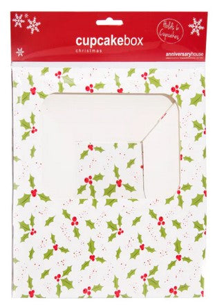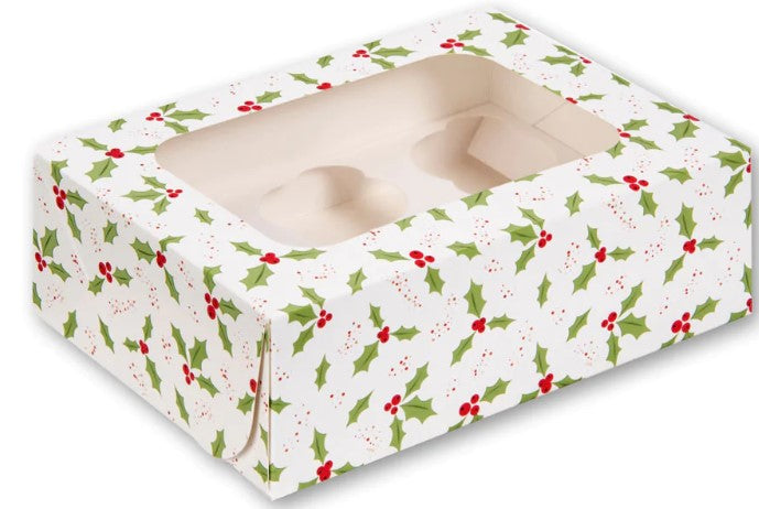 This easy to assemble cupcake/cake box, featuring a traditional Holly print is the perfect way to present cupcakes in festive style! The cardboard insert for 6 cupcakes can be used to hold the cakes in place or easily removed to provide more space for additional bakes. The clear viewing window on top provides a sneak peek at what's inside and the superior, sturdy quality means bakes are protected and secure. Supplied flat-packed in a polybag with header card for efficient, space-saving merchandising. Pop-up assembly is quick and simple, no folding necessary!