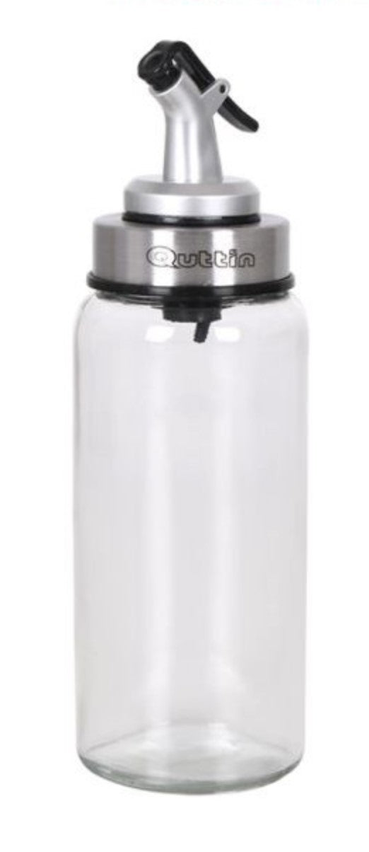 The Inde Inde Quttin Glass Oil Dispenser With Stopper is made of normal glass and a metal lid. The glass itself.