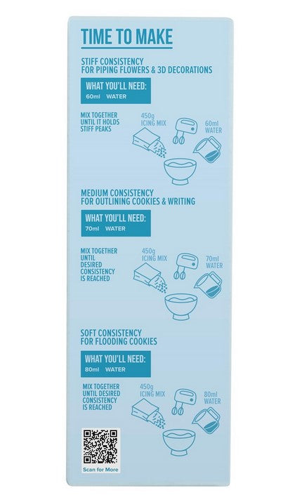 Meet your new frosting favourite – PME Royal Icing Mix. Whip up smooth, glossy icing effortlessly with this secret ingredient. Ready in minutes, it's perfect for beginners or busy bakers alike! The go-to choice for intricate piping and flooding cookies, this royal icing mix delivers delicious results without the fuss. Whether you're topping desserts or decorating cakes, PME's icing mixes ensure consistent results with that homemade taste everyone loves... it's the icing on the cake – literally!