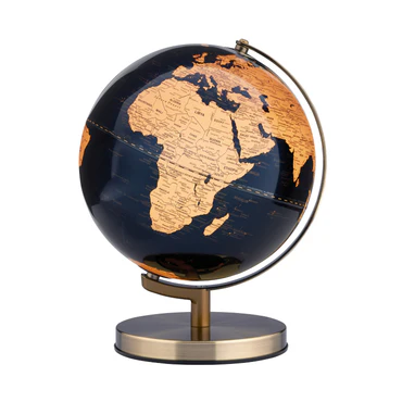 Globe with 25 cm diameter, integrated lighting, including charging plug with GaN and Power Delivery fast charging technology, 20W with USB-C and USB-A connection, antique gold-colored, brushed metal base, movable axis, metal / plastic, shiny, Blue / Bronze colours