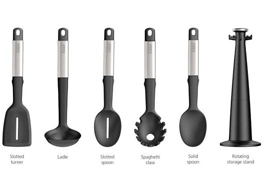 Elevate utensils have been designed to improve hygiene and minimise the mess made by placing utensils onto kitchen surfaces during use. Each tool has a weighted handle with an integrated tool rest that prevents the head from touching the work surface when placed down. This smart 5-piece set features utensils with heat-resistant silicone tool heads and sleek stainless-steel handles, plus a rotating storage stand with a non-slip base for easy tool selection. The set includes five essential utensils including a solid spoon, slotted spoon, slotted turner, spaghetti claw and a ladle.