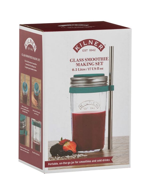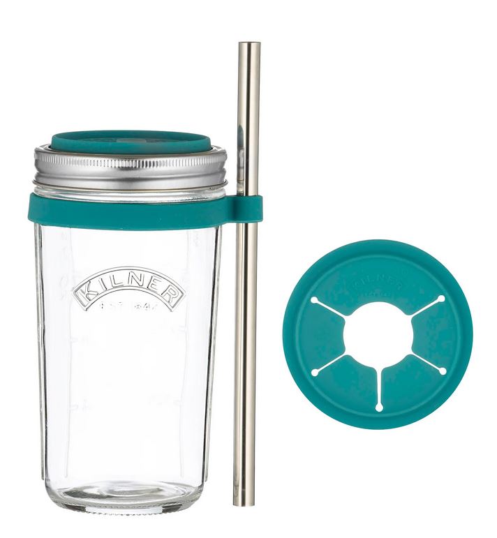 Set contains a 500ml Kilner Wide Mouth Jar with Screw Band, a Lid, Cap, Splash Guard and Straw Holder in Silicone and a Stainless Steel Smoothie Straw.
